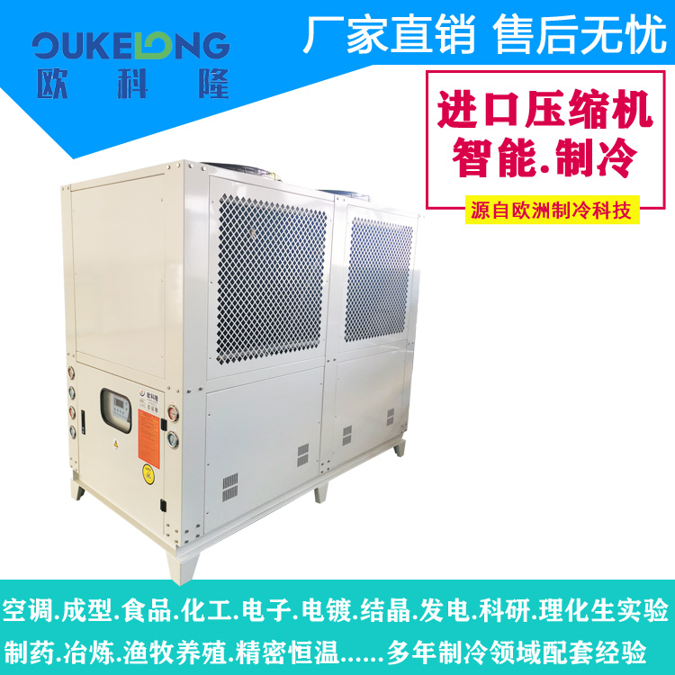 歐科隆30匹風冷冷水機組是一款高效節能的中大型商用制冷設備,采用一體化緊湊設計,制冷量達105kW,專為中型商業場所和工業應用設計。機組配備高效渦旋壓縮機(可選谷輪/丹佛斯品牌),制冷能效比(COP)達3.6以上,溫度控制范圍5℃~30℃,控溫精度±0.5℃。